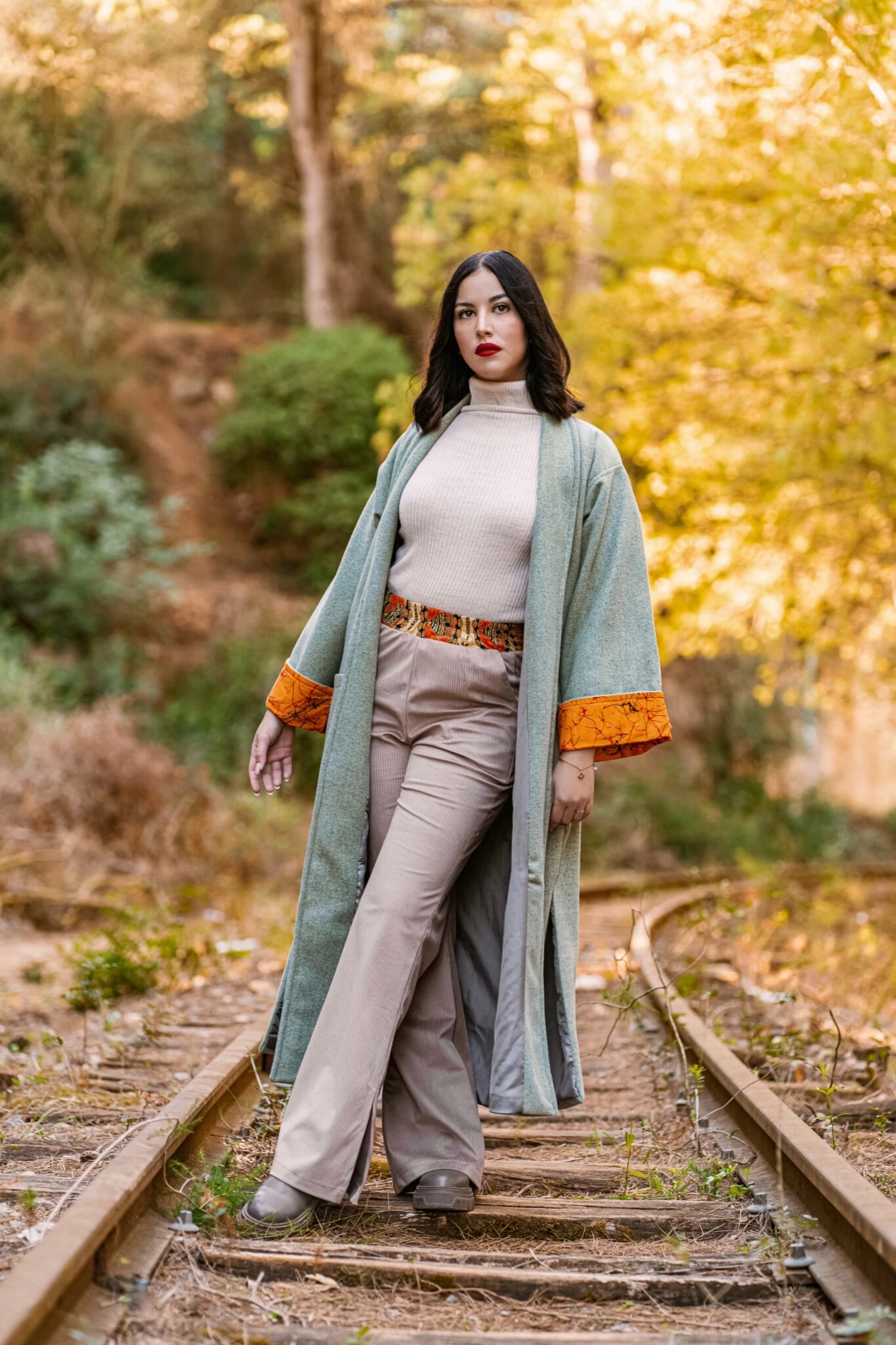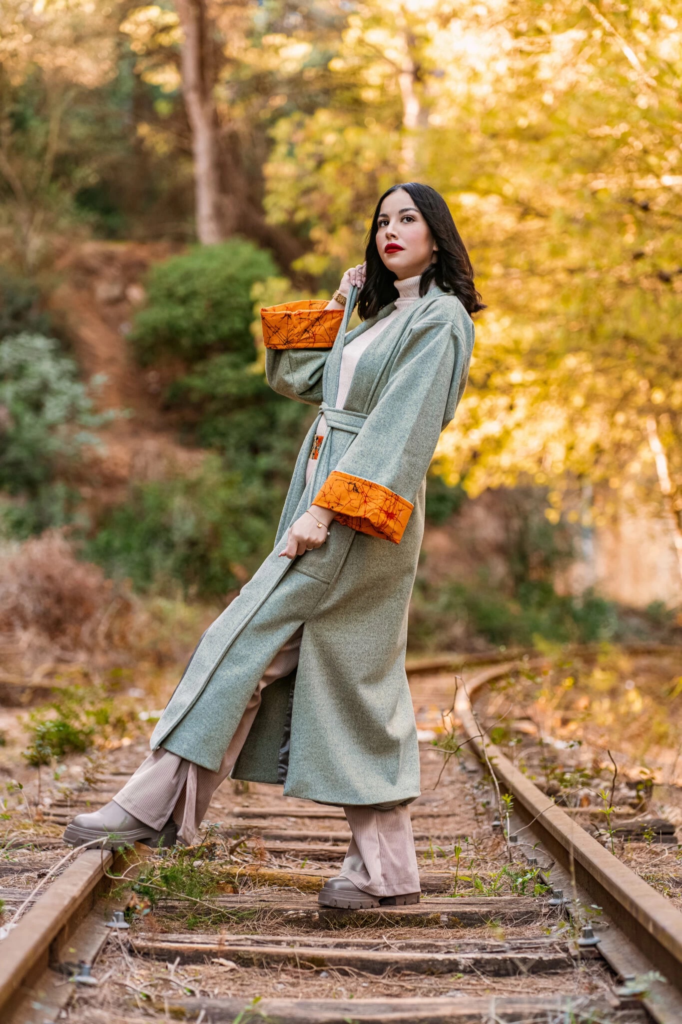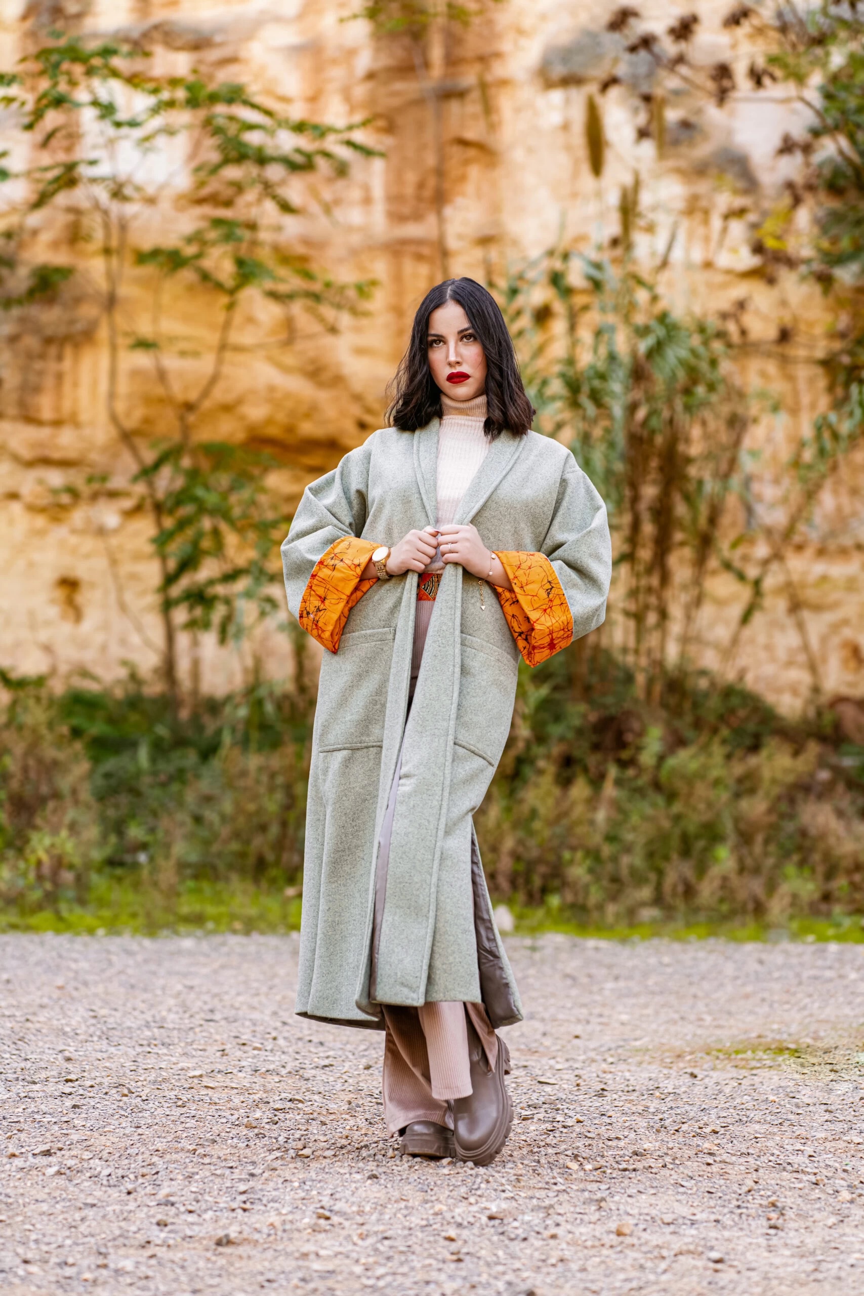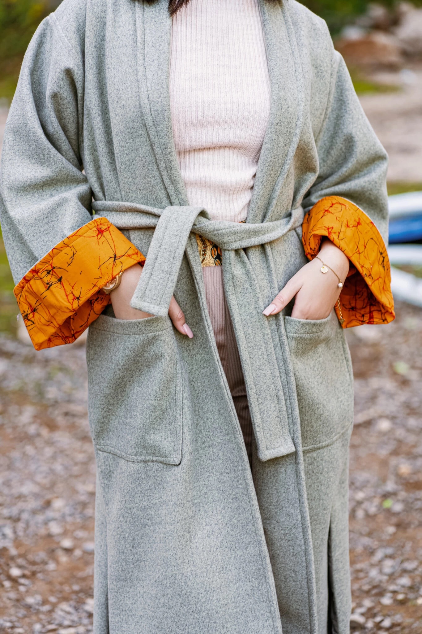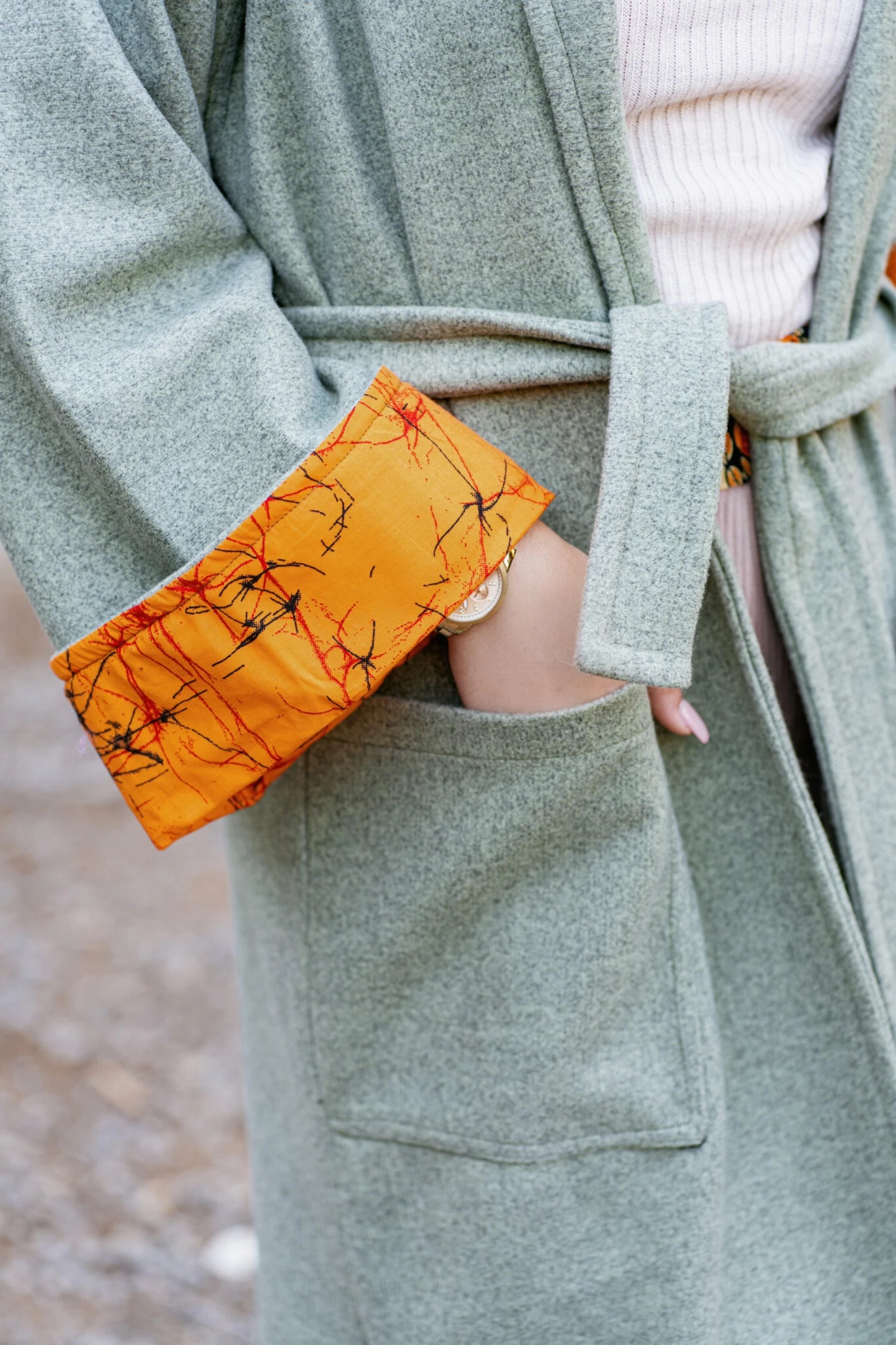 Manteau long en tissu de laine mélangée. Coupe flottante, manches longues avec revers en tissu wax, col à revers cranté. Poches devant grandes et fentes sur les côtés. Grande ceinture amovible à nouer à la taille.